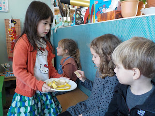 Een grote pompelmoes, het lijkt wel een zon, of volle maan.... Louise laat ons proeven. We leren de smaak "bitter" kennen. Gelukkig was de pompelmoes niet extreem bitter, die smaakte ook zoet. |